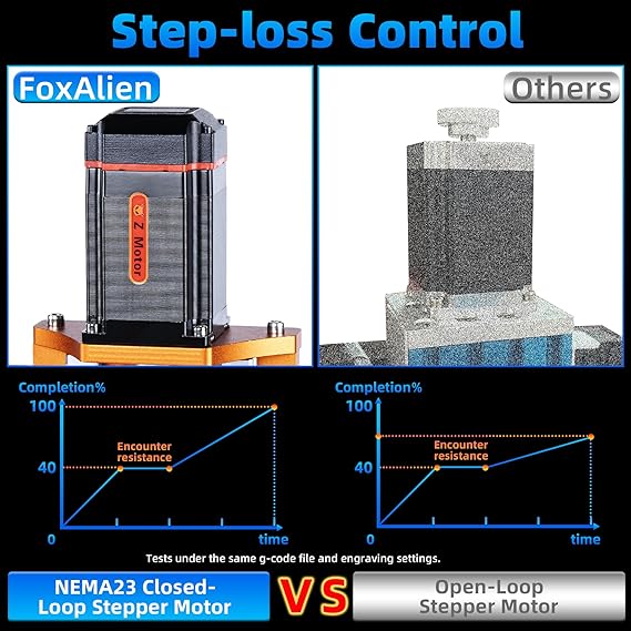 - Fast & Strong Closed-loop Motors: The Masuter 3S is equipped with NEMA23-76 closed-loop stepper motors. They have great performance in step-loss control. And the torque is 2.2 Nm. and its moving speed is up to 10000mm/min.